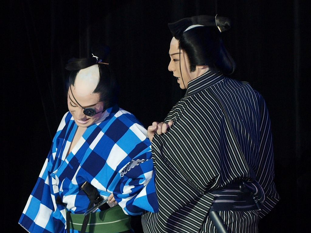 However, tonight was different. There was an accident on stage. In a small battle, Otomatsu's colleague (Ueo) broke his front teeth! He seemed not to control himself. As you know, Ueo is a comedian. His funny reactions made the audience laugh. All casts included Tatsumi desparetely tried to keep a straight face. After the play came to an end, Tatsumi said "The live on stage is the same as creature! Nobody knows the nearest future's happening." Take care, Ueo!