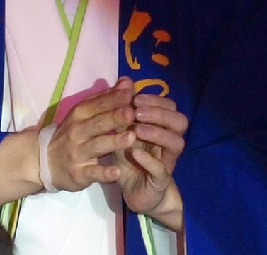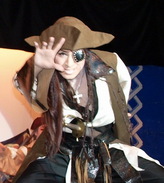 The last show on Sunday was titled "Oyome Samba" or "Samba for Bride". Members wore light gold wigs and matching dresses. In the latter all casts quickly transformed. There was a strange dressed dancer on stage. Do you know who he is?