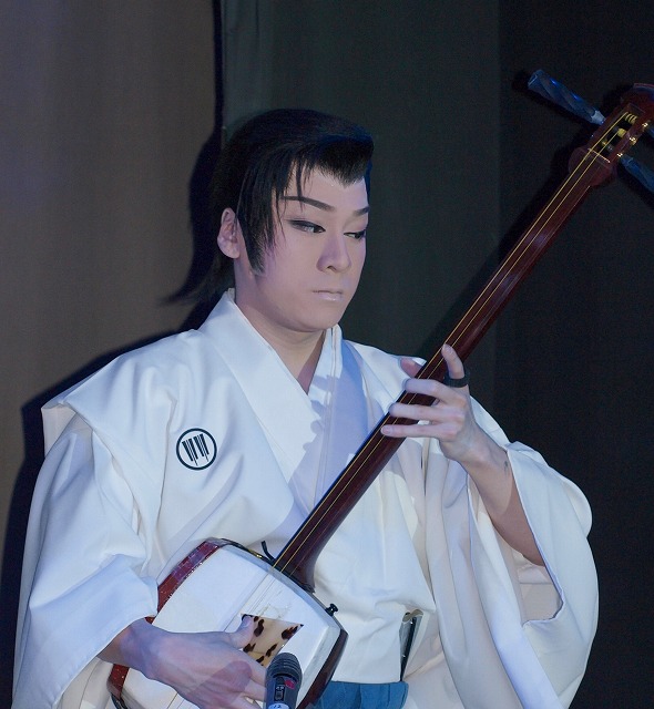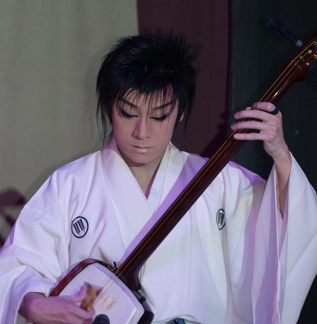 Tatsumi had a bandage on his right hand because he had an injury during a chambara performance on stage. However he played the shamisen (three-stringed Japanese banjo) with his right hand. He was a professional. Lackly he left it on the next day.